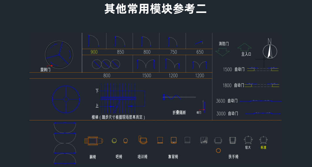 朝向:底层平面图标指北针(其它层平面图上不标朝向)