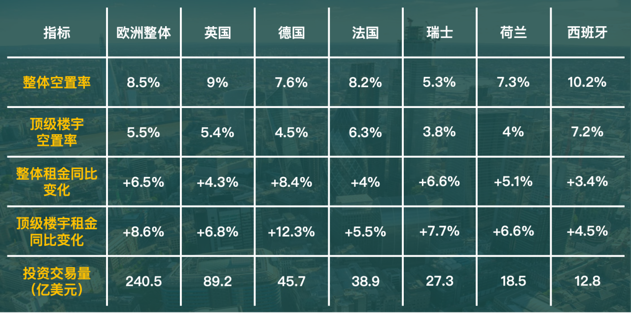租金:顶级楼宇租金同比上涨22.8%(欧洲涨幅第一),环比上涨4.2%;主要因半导体、汽车科技企业需求(如某半导体公司租赁2.1万平方米,租金溢价28%)。