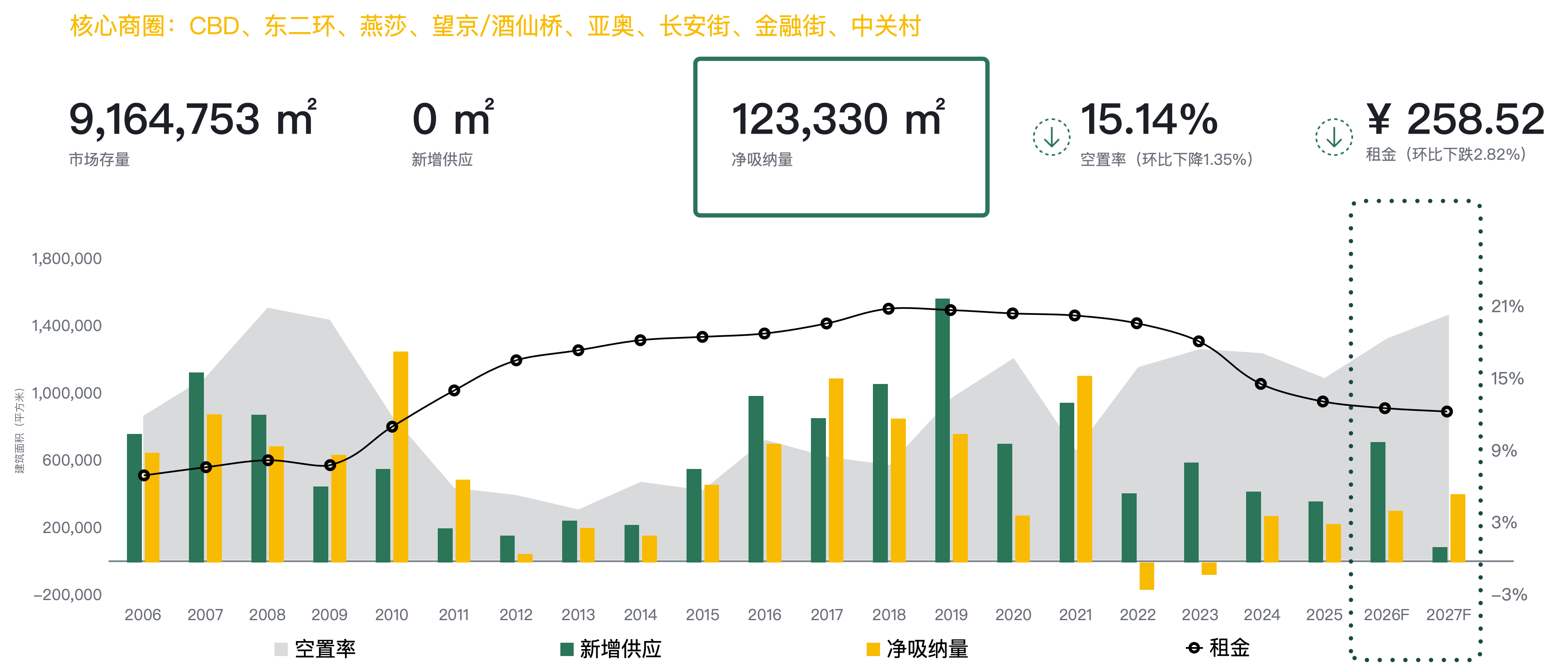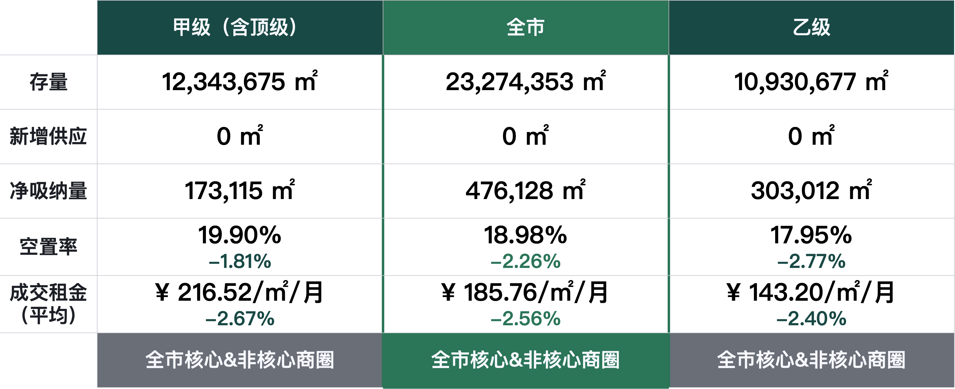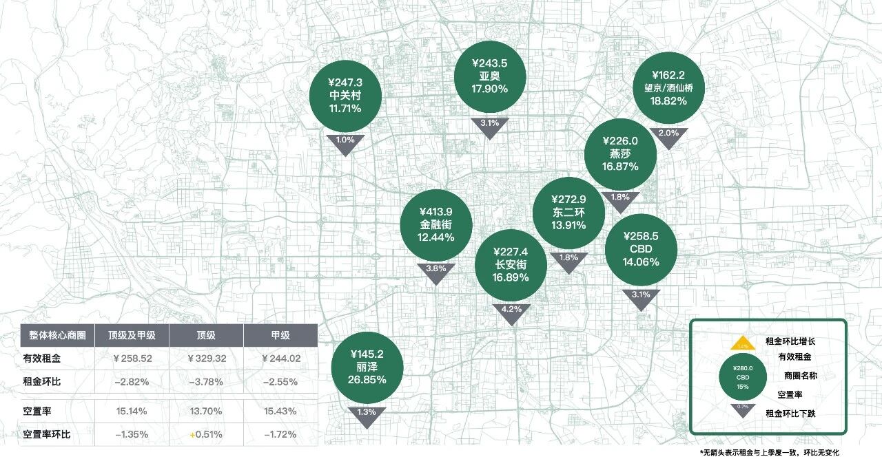 本季度全市整体写字楼空置率继续走低,环比上季度下降2.26个百分点,其中甲级(含顶级)写字楼空置率环比下降1.81个百分点。全市整体平均租金环比上季度下降2.56个百分点,甲级(含顶级)写字楼成交租金已接近每月每平方米215元。 本季度仍无新项目投入市场,全年预计供应量达到54.5万平方米,其中主要商圈供应量仅16.2万平方米,较去年主要商圈供应量减少32.2万平方米。全市整体写字楼净吸纳量环比上升47.6万平方米,其中甲级(含顶级)写字楼净吸纳量为173,115平方米,环比上升7.7万平方米。 2025年第三季度,写字楼租赁市场仍处于调整期,租户主导的议价空间扩大与行业竞争白热化双重压力下,写字楼租金价格延续下行通道;甲级(含顶级)写字楼成交租金环比下降2.67个百分点,为每月每平方米216.52元;乙级写字楼成交租金环比下降2.40个百分点,录得每月每平方米143.20元。 本季度核心商圈甲级(含顶级)写字楼净吸纳量为123,330平方米,空置率环比下降1.35个百分点,录得15.14%;成交租金环比上季度下跌2.82个百分点,为每月每平方米258.52元。 按行业成交面积(-/+)环比变化 从行业成交面积来看,政府机构、教育培训行业成交面积环比上季度涨幅均超过6万平方米,文化传媒、贸易、能源化工行业成交面积环比上季度均有上升。专业服务、金融和科技互联网行业成交面积环比均有回落,其中科技互联网行业降幅超过5万平方米。 按楼宇等级成交面积(-/+)环比变化 从楼宇等级成交面积来看,顶级和乙级写字楼成交面积环比上升,其中乙级写字楼成交面积涨幅超过8万平方米;甲级写字楼成交面积环比下降超过4万平方米。 按商圈成交面积(-/+)环比变化 从各商圈成交面积来看,望京/酒仙桥商圈本季度表现活跃,成交面积环比上季度涨幅超过1万平方米;燕莎、丽泽、长安街、CBD、金融街商圈相对稳定;中关村、亚奥和东二环商圈成交面积环比均有降低,中关村的降幅最为明显,超过8万平方米。