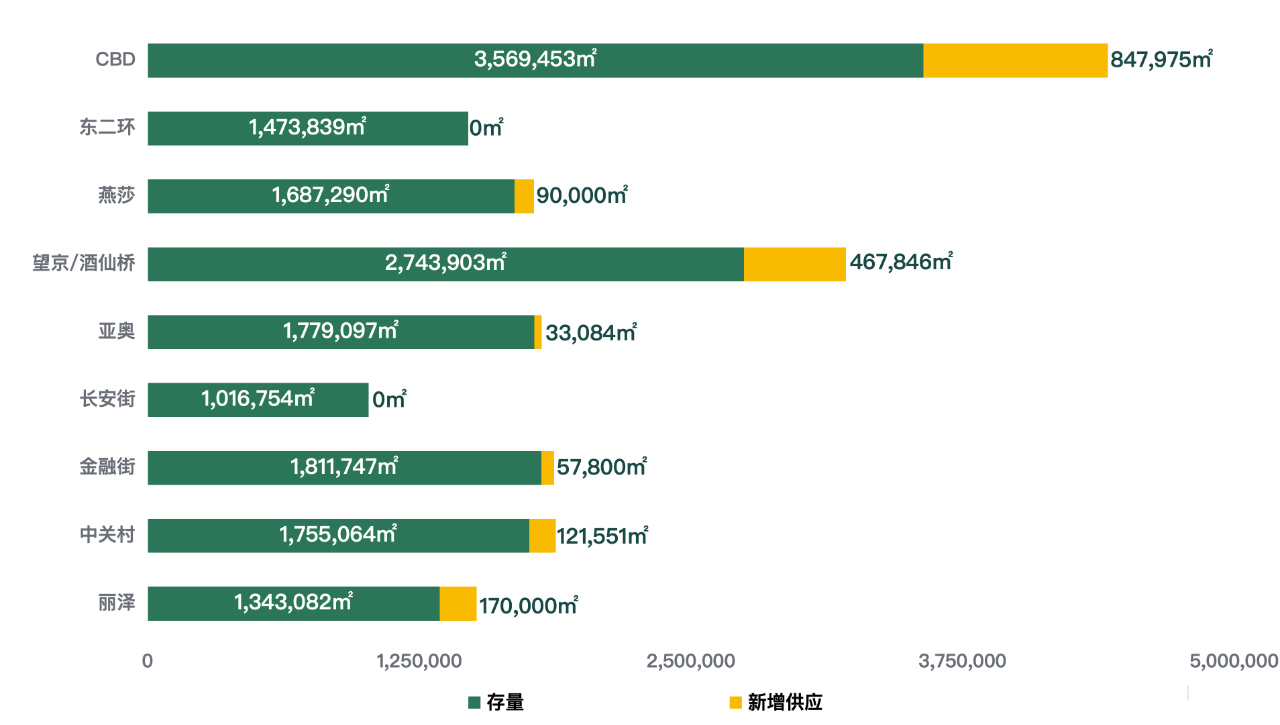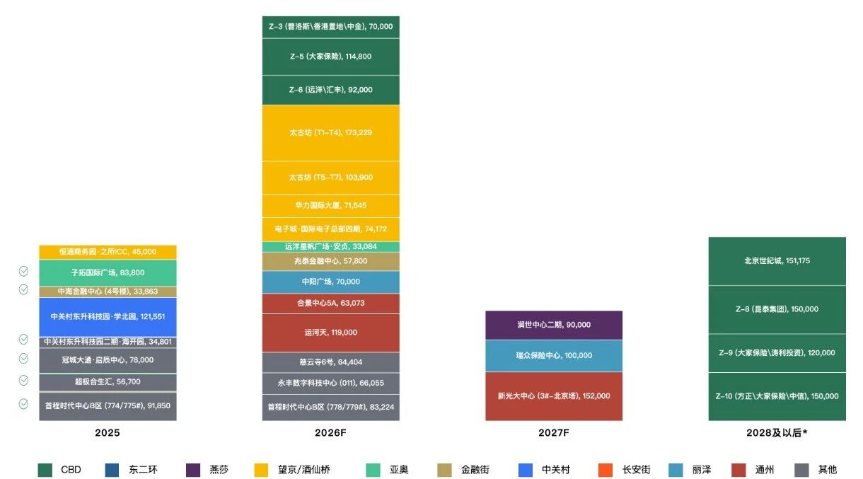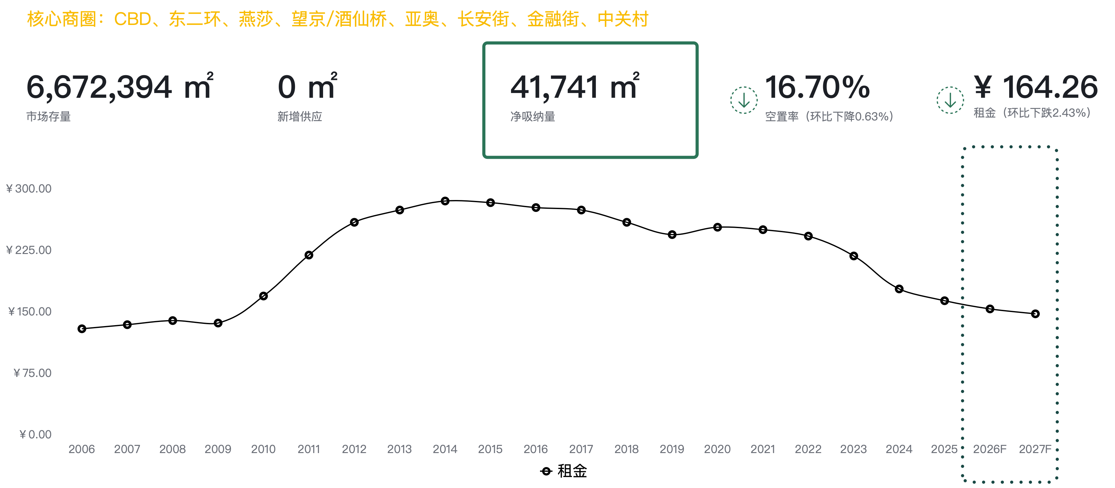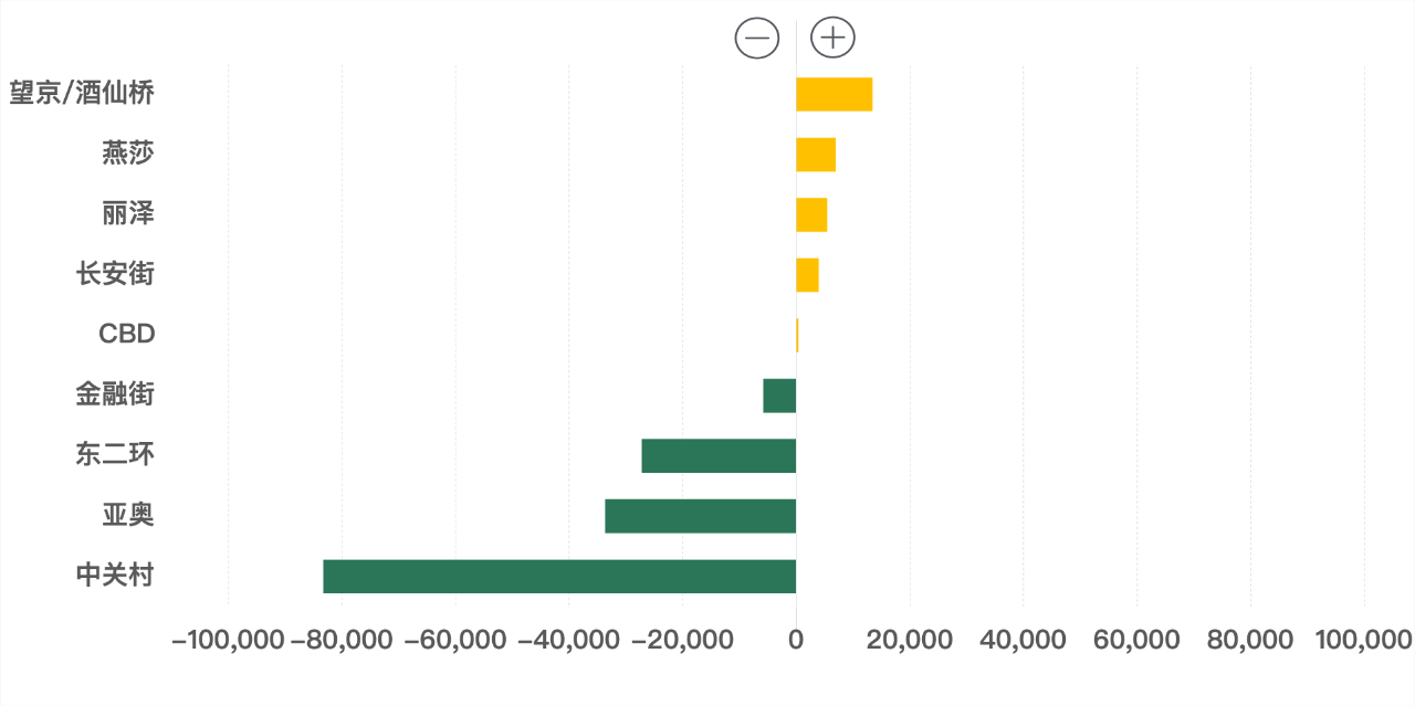 本季度全市整体写字楼空置率继续走低,环比上季度下降2.26个百分点,其中甲级(含顶级)写字楼空置率环比下降1.81个百分点。全市整体平均租金环比上季度下降2.56个百分点,甲级(含顶级)写字楼成交租金已接近每月每平方米215元。 本季度仍无新项目投入市场,全年预计供应量达到54.5万平方米,其中主要商圈供应量仅16.2万平方米,较去年主要商圈供应量减少32.2万平方米。全市整体写字楼净吸纳量环比上升47.6万平方米,其中甲级(含顶级)写字楼净吸纳量为173,115平方米,环比上升7.7万平方米。 2025年第三季度,写字楼租赁市场仍处于调整期,租户主导的议价空间扩大与行业竞争白热化双重压力下,写字楼租金价格延续下行通道;甲级(含顶级)写字楼成交租金环比下降2.67个百分点,为每月每平方米216.52元;乙级写字楼成交租金环比下降2.40个百分点,录得每月每平方米143.20元。 本季度核心商圈甲级(含顶级)写字楼净吸纳量为123,330平方米,空置率环比下降1.35个百分点,录得15.14%;成交租金环比上季度下跌2.82个百分点,为每月每平方米258.52元。 按行业成交面积(-/+)环比变化 从行业成交面积来看,政府机构、教育培训行业成交面积环比上季度涨幅均超过6万平方米,文化传媒、贸易、能源化工行业成交面积环比上季度均有上升。专业服务、金融和科技互联网行业成交面积环比均有回落,其中科技互联网行业降幅超过5万平方米。 按楼宇等级成交面积(-/+)环比变化 从楼宇等级成交面积来看,顶级和乙级写字楼成交面积环比上升,其中乙级写字楼成交面积涨幅超过8万平方米;甲级写字楼成交面积环比下降超过4万平方米。 按商圈成交面积(-/+)环比变化 从各商圈成交面积来看,望京/酒仙桥商圈本季度表现活跃,成交面积环比上季度涨幅超过1万平方米;燕莎、丽泽、长安街、CBD、金融街商圈相对稳定;中关村、亚奥和东二环商圈成交面积环比均有降低,中关村的降幅最为明显,超过8万平方米。