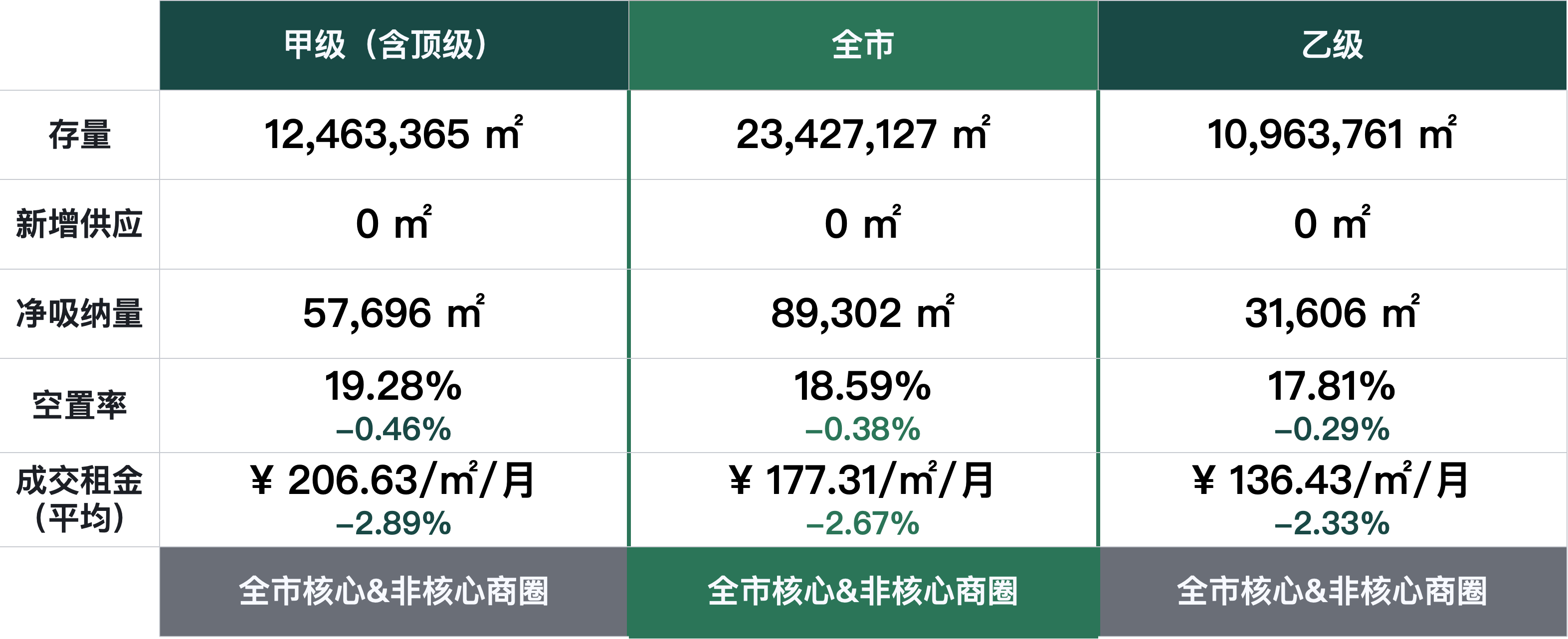 本季度核心商圈甲级(含顶级)写字楼净吸纳量为-43,633平方米,空置率环比上升0.47个百分点,录得15.70%;成交租金继续走低,环比下跌2.90个百分点,为每月每平方米246.35元。