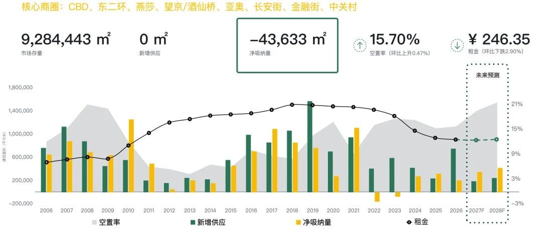 2026年全年投入市场的新增供应量预计将达到138万平方米,其中核心商圈约75万平方米(含自用),不断扩充市场选择。在2027-2029年期间,全市主要商圈新增供应量将主要集中在CBD商圈;未来,望京/酒仙桥、燕莎、丽泽商圈也将有新的写字楼项目相继入市。