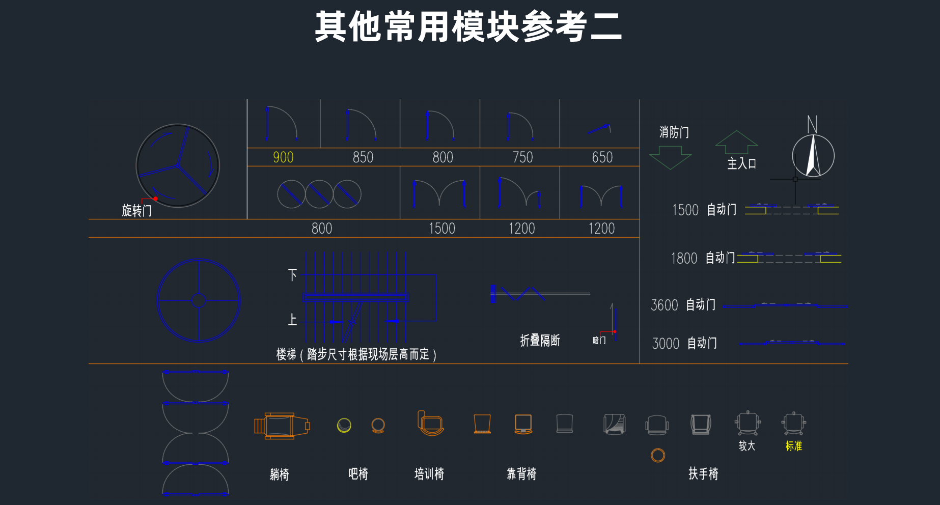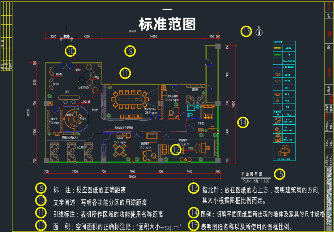 朝向:底层平面图标指北针(其它层平面图上不标朝向)