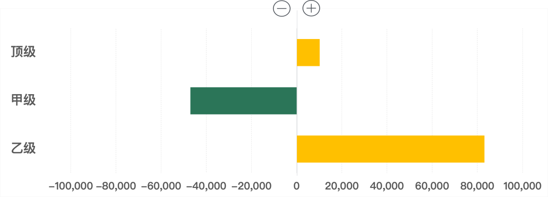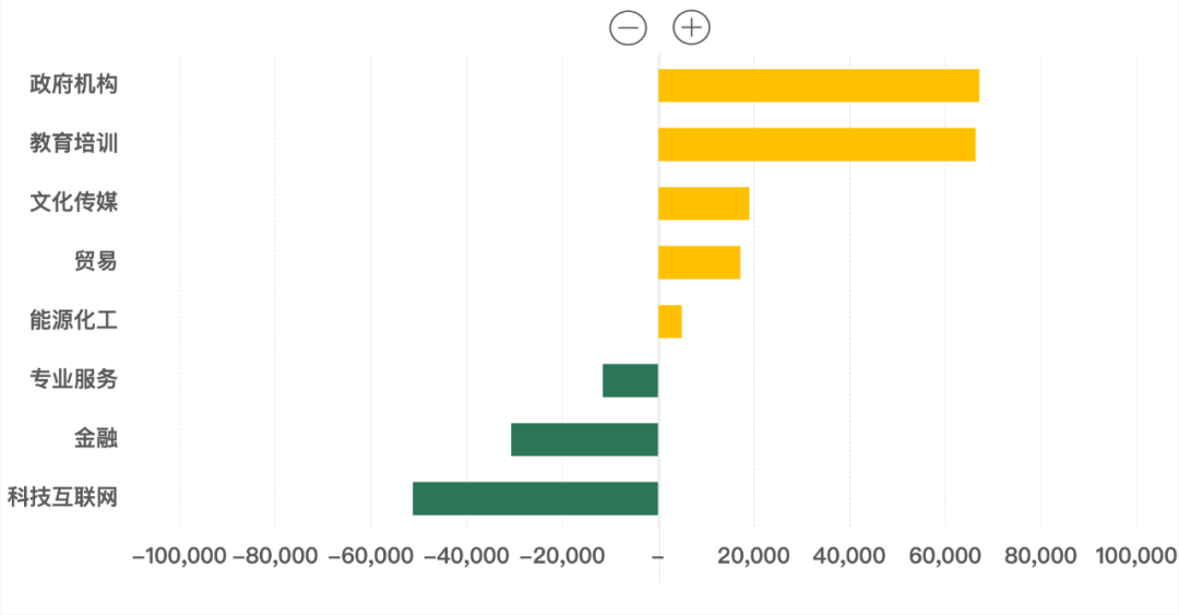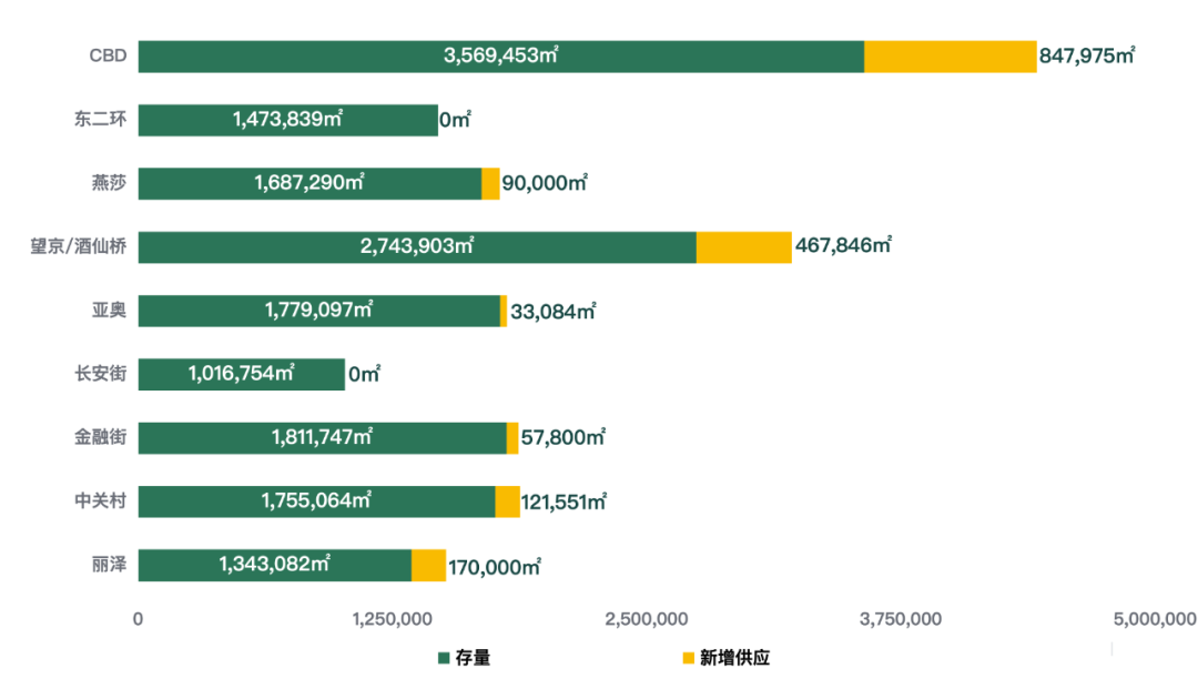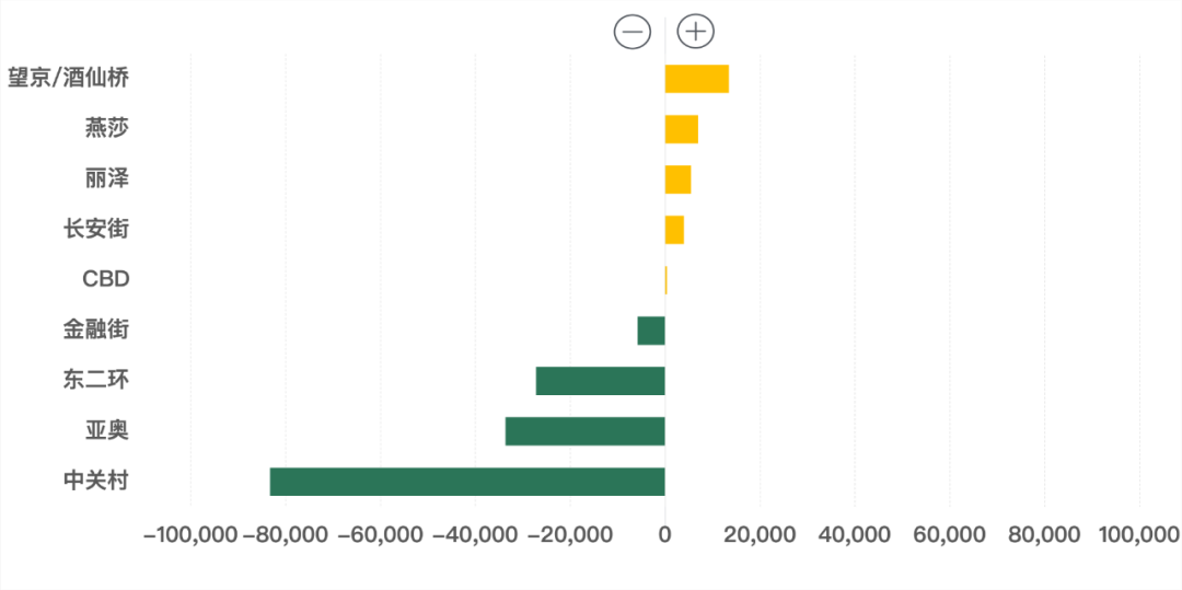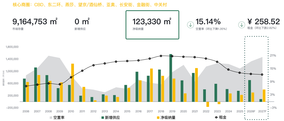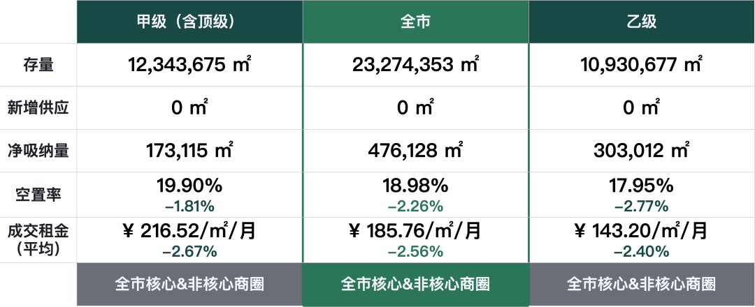 本季度全市整体写字楼空置率继续走低,环比上季度下降2.26个百分点,其中甲级(含顶级)写字楼空置率环比下降1.81个百分点。全市整体平均租金环比上季度下降2.56个百分点,甲级(含顶级)写字楼成交租金已接近每月每平方米215元。 本季度仍无新项目投入市场,全年预计供应量达到54.5万平方米,其中主要商圈供应量仅16.2万平方米,较去年主要商圈供应量减少32.2万平方米。全市整体写字楼净吸纳量环比上升47.6万平方米,其中甲级(含顶级)写字楼净吸纳量为173,115平方米,环比上升7.7万平方米。 2025年第三季度,写字楼租赁市场仍处于调整期,租户主导的议价空间扩大与行业竞争白热化双重压力下,写字楼租金价格延续下行通道;甲级(含顶级)写字楼成交租金环比下降2.67个百分点,为每月每平方米216.52元;乙级写字楼成交租金环比下降2.40个百分点,录得每月每平方米143.20元。 本季度核心商圈甲级(含顶级)写字楼净吸纳量为123,330平方米,空置率环比下降1.35个百分点,录得15.14%;成交租金环比上季度下跌2.82个百分点,为每月每平方米258.52元。 按行业成交面积(-/+)环比变化 从行业成交面积来看,政府机构、教育培训行业成交面积环比上季度涨幅均超过6万平方米,文化传媒、贸易、能源化工行业成交面积环比上季度均有上升。专业服务、金融和科技互联网行业成交面积环比均有回落,其中科技互联网行业降幅超过5万平方米。 按楼宇等级成交面积(-/+)环比变化 从楼宇等级成交面积来看,顶级和乙级写字楼成交面积环比上升,其中乙级写字楼成交面积涨幅超过8万平方米;甲级写字楼成交面积环比下降超过4万平方米。 按商圈成交面积(-/+)环比变化 从各商圈成交面积来看,望京/酒仙桥商圈本季度表现活跃,成交面积环比上季度涨幅超过1万平方米;燕莎、丽泽、长安街、CBD、金融街商圈相对稳定;中关村、亚奥和东二环商圈成交面积环比均有降低,中关村的降幅最为明显,超过8万平方米。