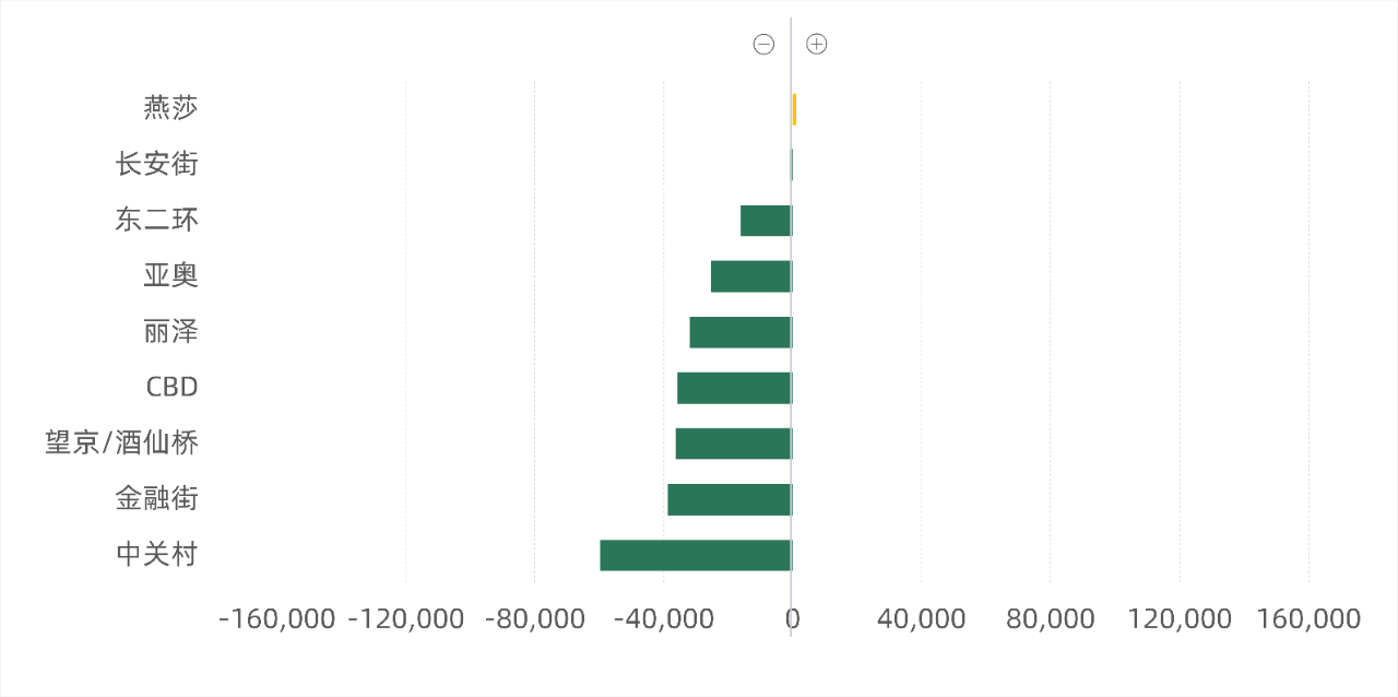 从各商圈成交面积来看,燕莎、长安街商圈表现相对稳定。在其他主要商圈中,除东二环商圈成交面积降幅未超过2万平方米外,其余商圈成交面积环比均有回落,中关村商圈成交面积降幅接近6万平方米。