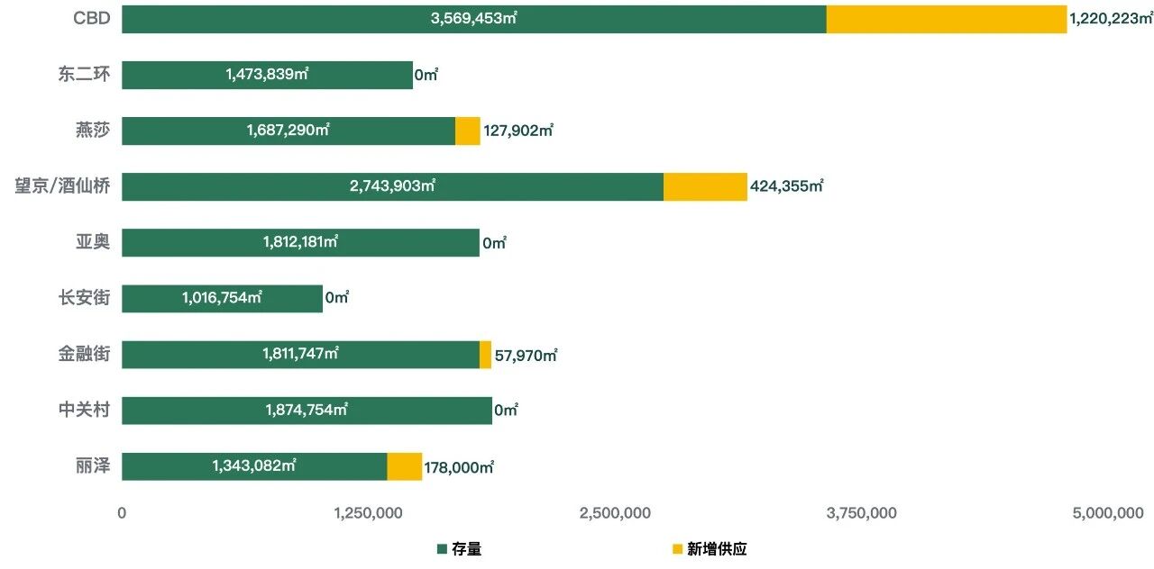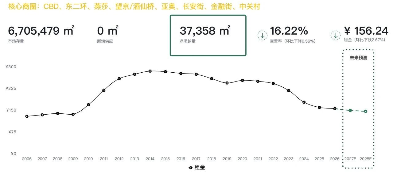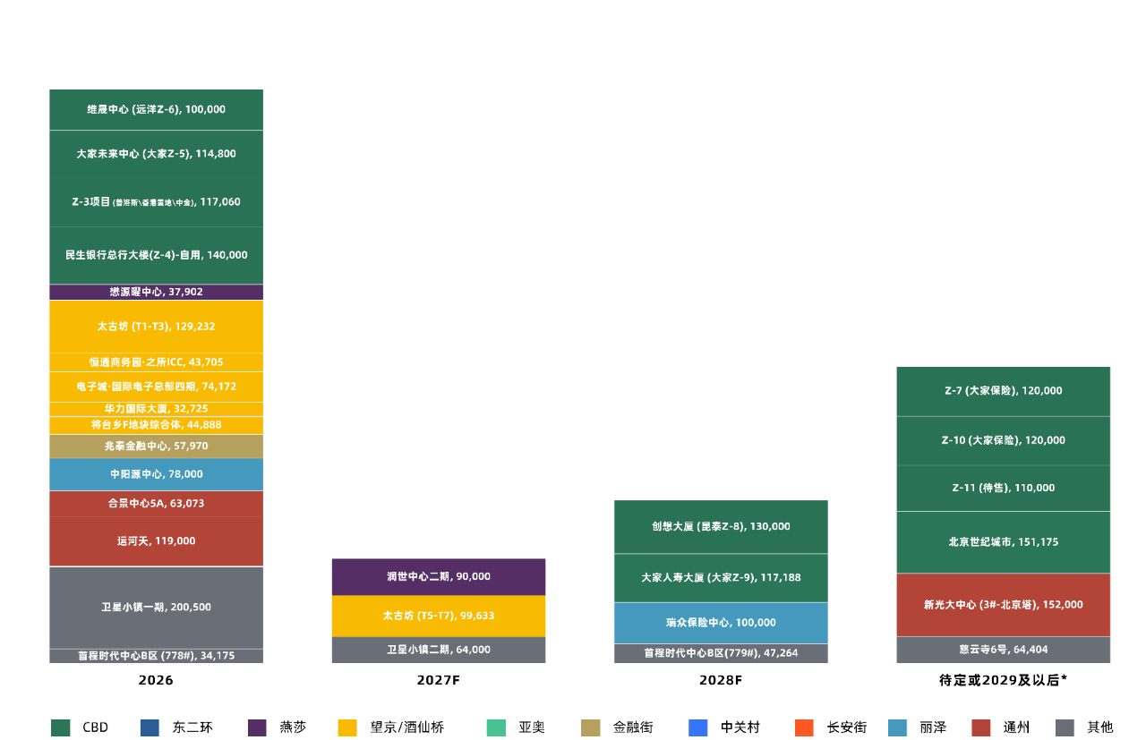 2026年全年投入市场的新增供应量预计将达到138万平方米,其中核心商圈约75万平方米(含自用),不断扩充市场选择。在2027-2029年期间,全市主要商圈新增供应量将主要集中在CBD商圈;未来,望京/酒仙桥、燕莎、丽泽商圈也将有新的写字楼项目相继入市。