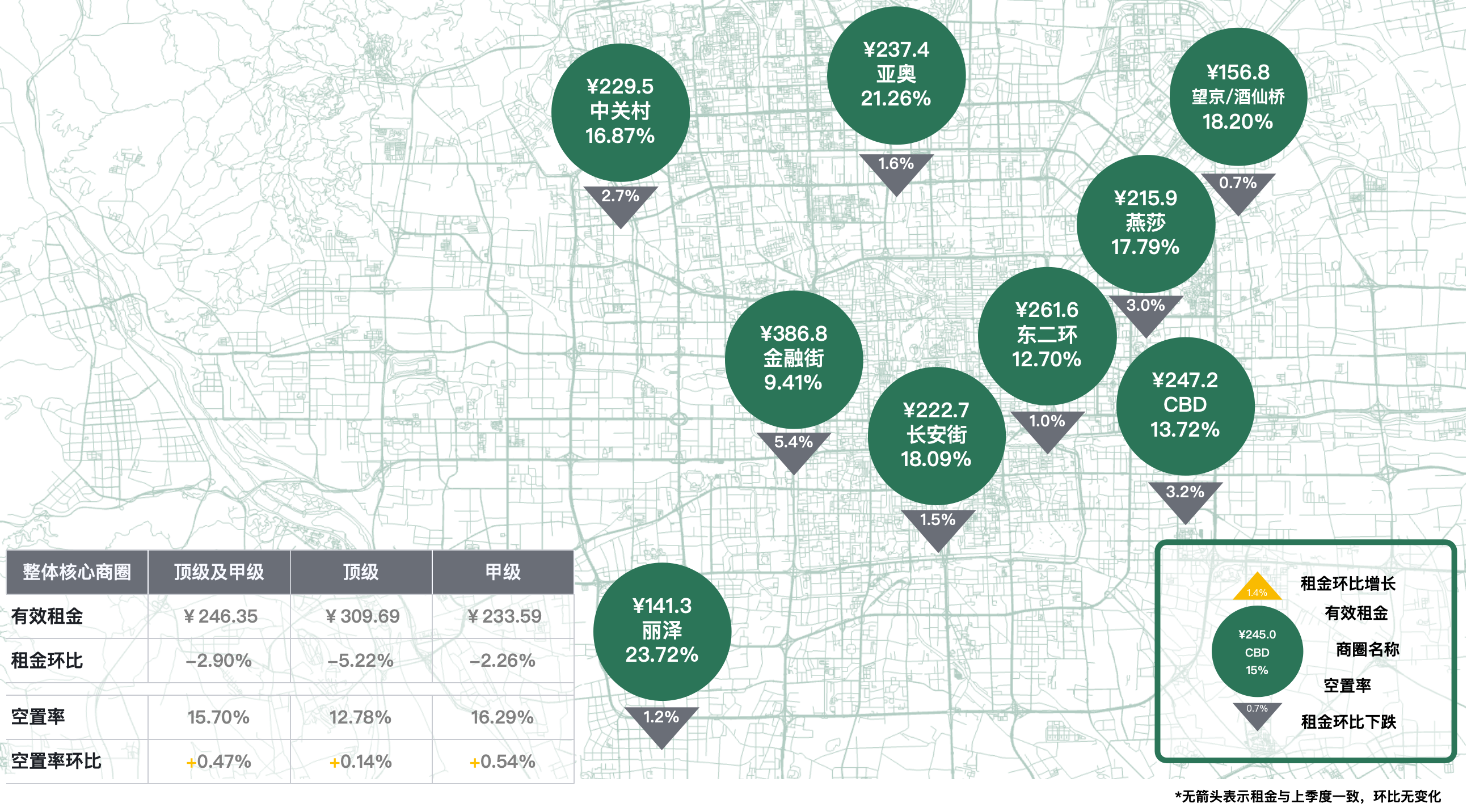 本季度核心商圈甲级(含顶级)写字楼净吸纳量为-43,633平方米,空置率环比上升0.47个百分点,录得15.70%;成交租金继续走低,环比下跌2.90个百分点,为每月每平方米246.35元。