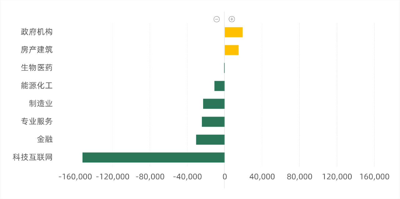 从行业成交面积来看,政府机构、房产建筑行业成交面积环比均有上升。科技互联网、金融、专业服务、制造业等行业成交面积环比均有回落,成交面积环比降幅均超过2万平方米。